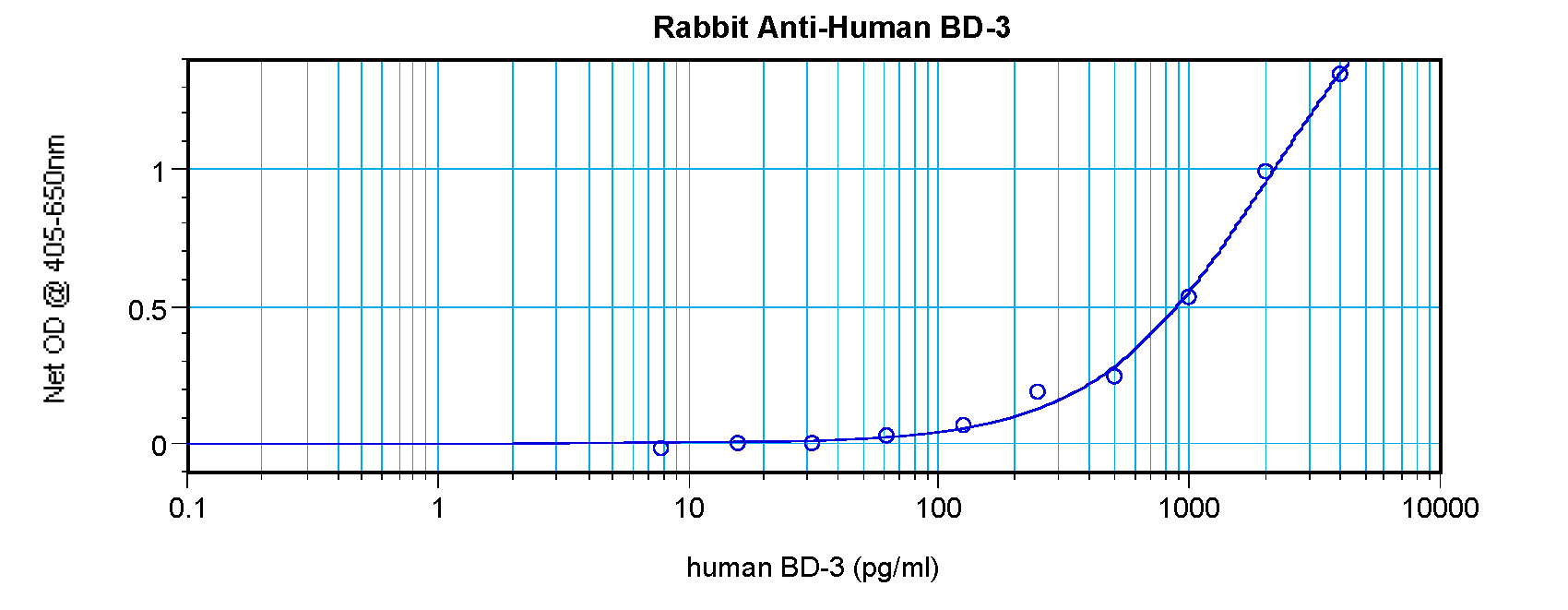 To detect hBD-3 by sandwich ELISA (using 100 μL/well antibody solution) a concentration of 0.5 - 2.0 μg/mL of this antibody is required. This antigen affinity purified antibody, in conjunction with our biotinylated Anti-Human BD-3 as a detection antibody, allows the detection of at least 0.2 - 0.4 ng/well of recombinant hBD-3.