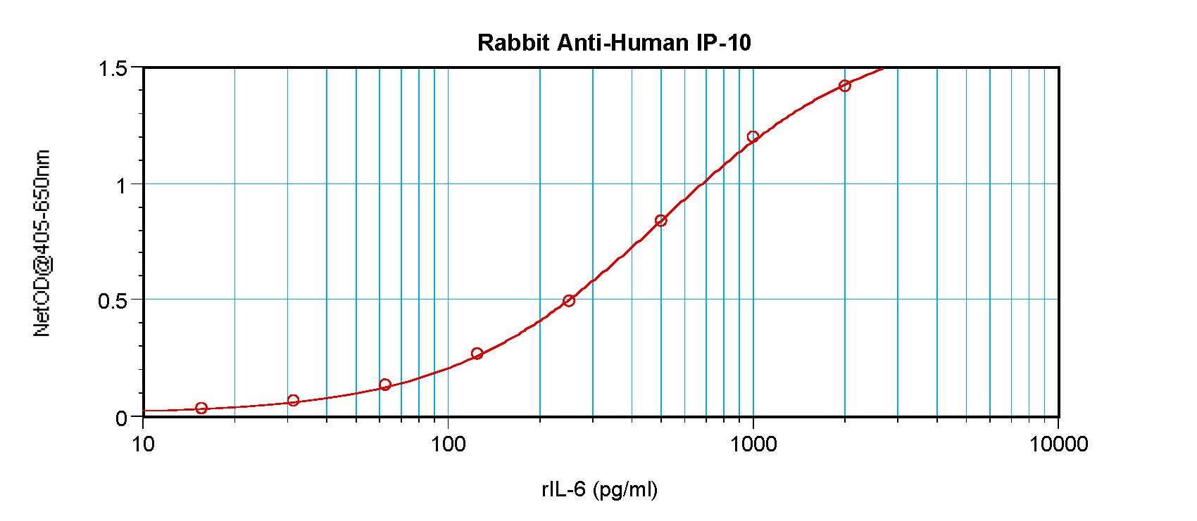 To detect hIP-10 by direct ELISA (using 100 μL/well antibody solution) a concentration of at least 0.5 μg/mL of this antibody is required. This antigen affinity purified antibody, in conjunction with compatible secondary reagents, allows the detection of 0.2 - 0.4 ng/well of recombinant hIP-10.