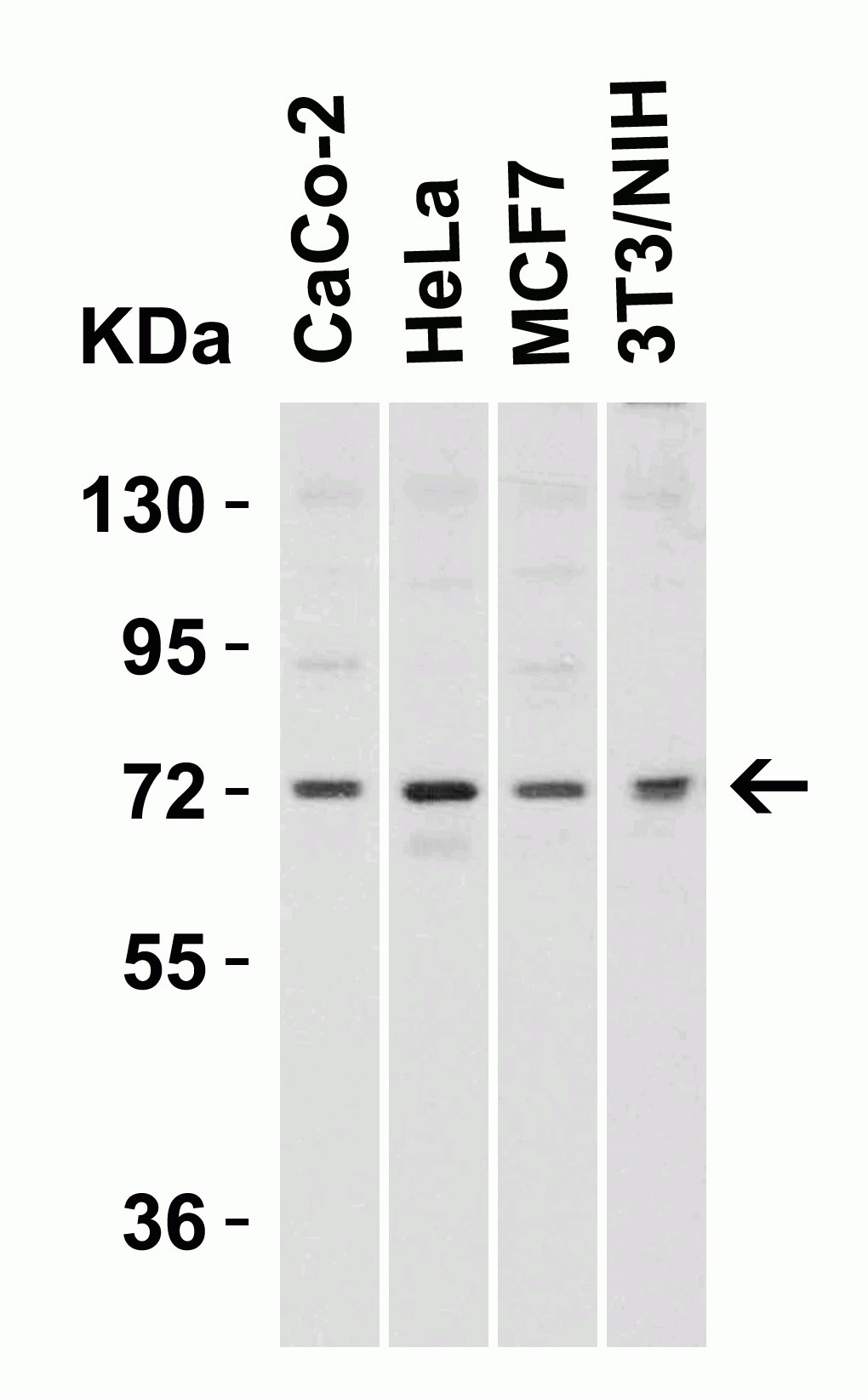 Independent Antibody Validation in Cell lines (Figure 1) shows similar TOM70 expression profile in human, mouse and rat cell lines detected by two independent anti-TOM70 antibodies that recognize different epitopes, 4949 against N-terminus domain and 4959 against central domain.TOM70 proteins are detected in the most tested cell lines at different expression levels by the two independent antibodies.