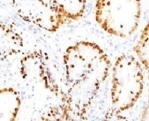 2. The prediluted format is supplied in a dropper bottle and is optimized for use in IHC. After epitope retrieval step (if required), drip mAb solution onto the tissue section and incubate at RT for 30 min.